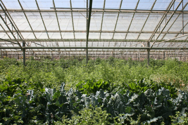 Hot water from the distilling process and compost-heated water pipes provide radiant heat beneath grow beds.